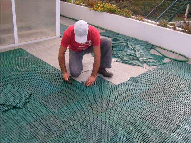 Colocação das placas anti-derrapante com canais de escoamento das águas