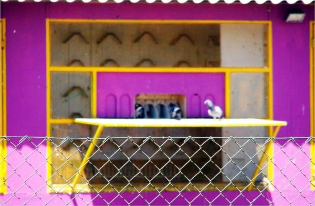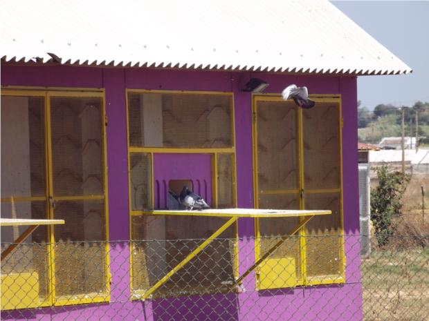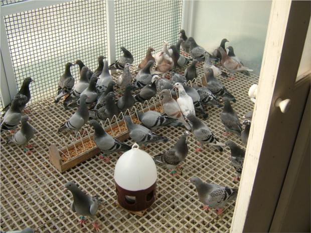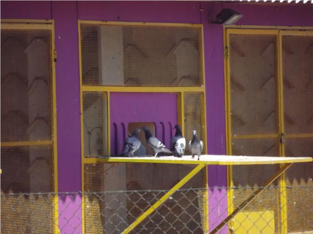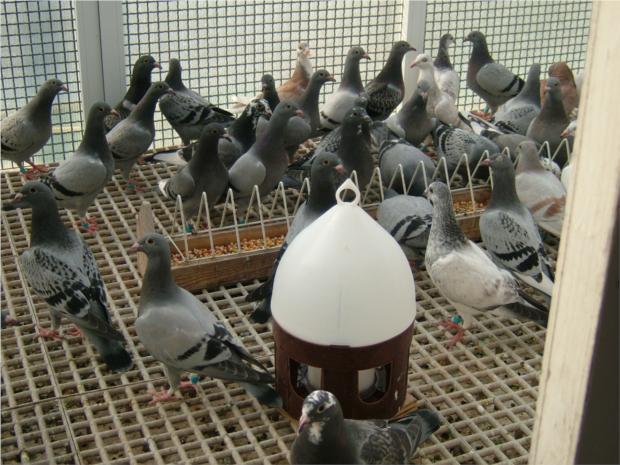 Os primeiros pombos indecisos na entrada. De algum modo uma entrada dificil, por ser uma entrada chamada "capela" que apenas possibilita a entrada de um pombo de cada vez, o que impede uma entrada simultanea "uns por cima dos outros" , conforme a justificação que me foi dada para o facto dos meus pombos não marcarem nos treinos.