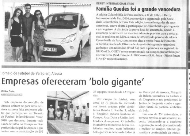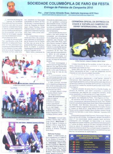 O grande vencedor da prova final do Derby Internacional de Faro 2010 foi a Família Guedes (Oliveira de Azeméis), que assim conquistou o automóvel (curiosamente, pelo segundo ano consecutivo também), tendo ainda classificado um outro pombo em 6º lugar na prova.
