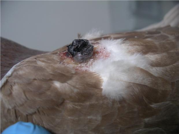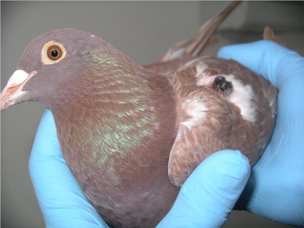 No ano de 2011 constatei em três ou quatro pombos o aparecimento de umas bolhas negras em locais do corpo indiferenciados e que ao fim de alguns dias rebentam e apresentam o aspecto nas fotos apresentado....acabam por secar e cair como se nada tivesse acontecido.......até hoje não consegui saber na realidade de que se trata apesar de já me terem sido dadas algumas explicações....este ano de 2013 ainda não tive qualquer caso........