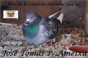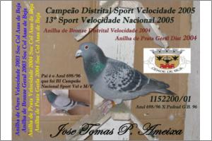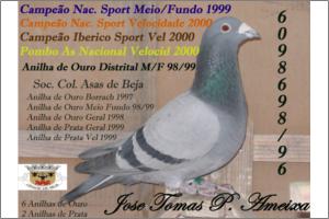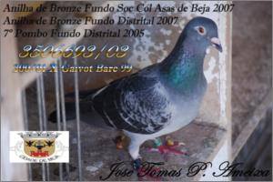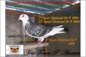 "200" Macho Pedrado Origem: Jose Tomas Piçarra Ameixa Campeão Distrital Sport Velocidade 2005 13º Sport Velocidade Nacional 2005 Anilha de Ouro velocidade na Soc Col Asas de Beja2003 Anilha de Bronze Geral na Soc Col Asas de Beja2003 Anilha de Bronze Distrital Velocidade 2004 Anilha de Prata Distrital Geral 2004, Anilha de Prata Velocidade 2004 na Soc Col Asas de Beja Anilha de Prata Geral na Soc Col Asas de Beja 2004 Filho do Bi Campeão Nacional Sport Actualmente dos melhores Reprodutores do pombal