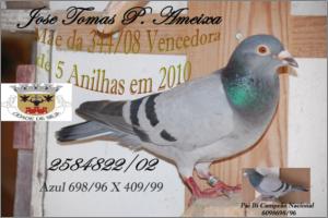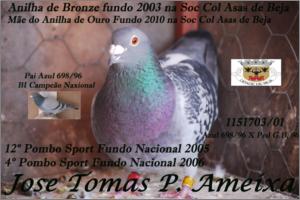 "Enxovalhada" Fêmea Pedrado escuro Origem: Jose Tomas Piçarra Ameixa Anilha de Bronze Fundo 2003 na Soc Col Asas de Beja Filha do Azul Bi Campeão Nacional Sport Mãe do Anilha de Ouro Fundo 2010 na Soc Col Asas de Beja 1º Sport Fundo Distrital 2006 12º Pombo Sport Fundo Nacional 2005 4º Pombo Sport Fundo Nacional 2006