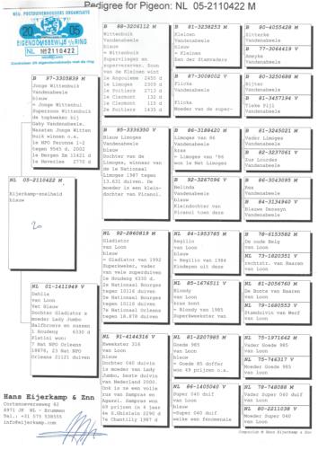 Pedigree de um dos reprodutores base. Neto do ''Wittenbuik'' de Gaby Vandenabeele. Um pombos fabuloso que nos deu muitas alegrias. Direto Eijerkamp.