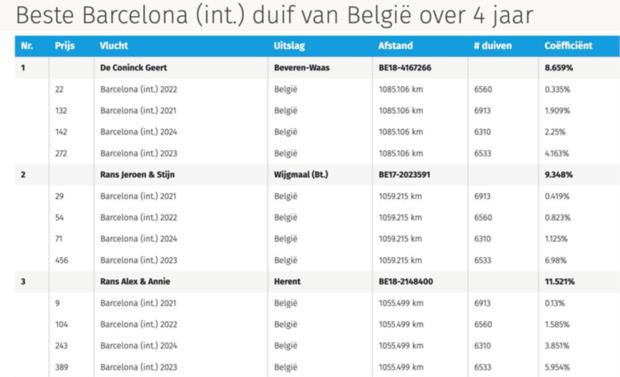As classificações da BUCKI, mãe da nossa fêmea reprodutora, de Barcelona, durante 4 anos: 3º Pombo Às da Bélgica!