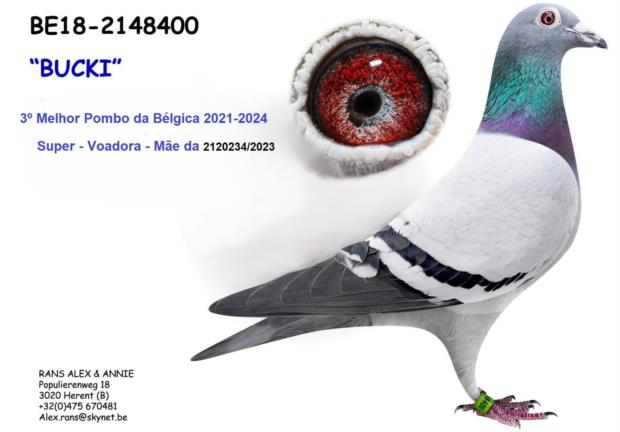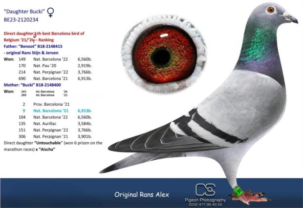 A mãe é filha directa da excecpcional “BUCKI”, uma das melhores fêmeas do Grande Fundo belga atual. A “Bucki” destacou-se em Barcelona ao longo de vários anos, alcançando o 3.º Pombo Ás da Bélgica de Barcelona 2024, resultado construído com regularidade e desempenho contínuo em provas de extrema dureza.