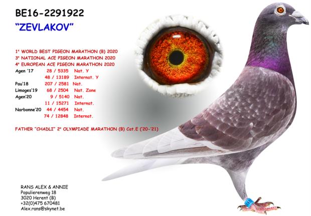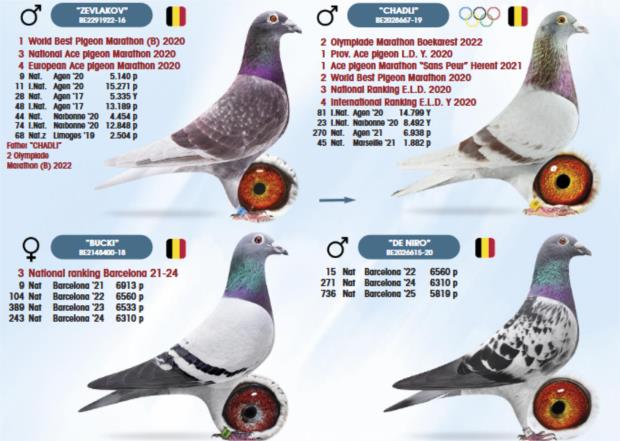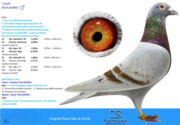 É neto direto do extraordinário “ZELAKOV” (BE16-2291922), de Alex & Annie Rans, um dos mais completos pombos de maratona da sua geração: 1.º Melhor Pombo do Mundo de Maratona (Bélgica 2020), 3.º Pombo Ás Nacional de Maratona 2020 e 4.º Pombo Ás Europeu de Maratona no mesmo ano. Para além dos títulos, destacou-se por classificações de topo em concursos de elevada dureza, como Argenton, Narbonne e Limoges, enfrentando grandes contingentes nacionais e internacionais, confirmando a sua consistência em cenários de máxima exigência. É ainda pai doExtraordinário “Chadli”, 2.º Pombo Olímpico de Maratona, afirmando-se igualmente como reprodutor de referência.