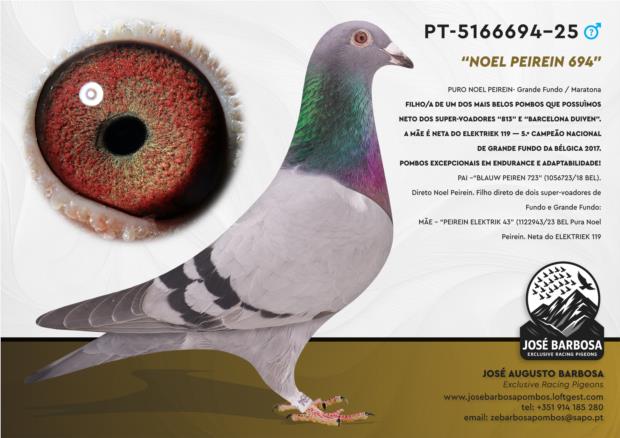 O segundo jovem pombo que temos em cedência, origem absolutamente , excepcional,  ''NOEL PEIREN 694” – puro Noel Peiren, linha de referência no Grande Fundo . Pombos que se adaptam a qualquer colónia! De uma rusticidade a toda a prova!