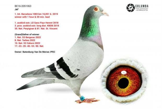 O famoso “JEF” (BE16-2051063) – um dos mais importantes reprodutores de Grande Fundo da Bélgica atual: Vencedor do 1.º Internacional Barcelona 2019 (16.051 pombos),! Como reprodutor, é base de múltiplos vencedores e classificados nacionais de topo, afirmando-se como referência na construção de linhas para maratona.