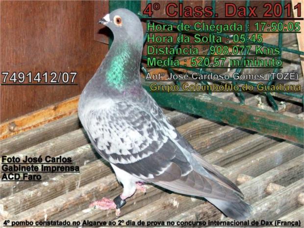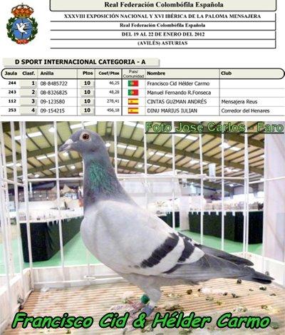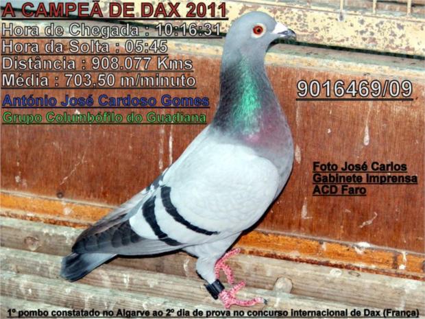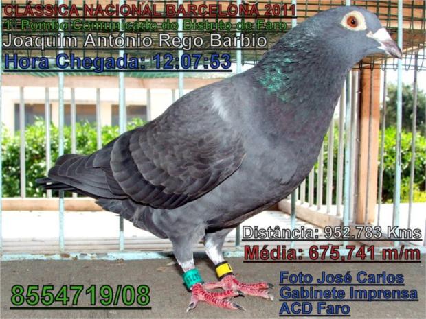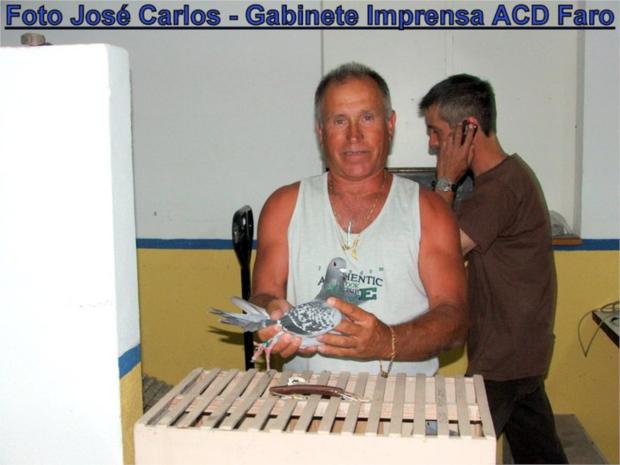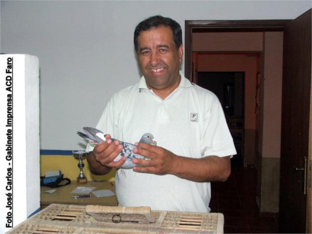 Domingos Campinas (Grupo Columbófilo de Cacela) com o pombo Vencedor Distrital ACD Faro da prova de Valência del Cid 1, entre 3101 pombos participantes, constatado às 14:32:03, percorrendo os 683,854 Kms, a uma média de 1.418,63 m/m