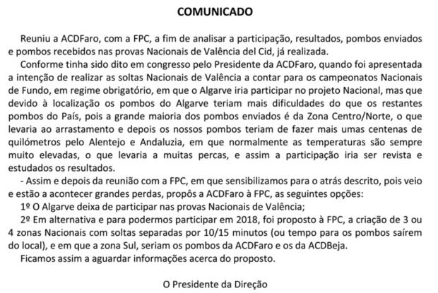 No seguimento da informação prestada anteriormente e constando do regulamento dos campeonatos distritais 2018, vem a ACD Faro informar que serão reanilhados para controle nas provas de Valência e V Alcântara, os pombos dos seguintes columbófilos: