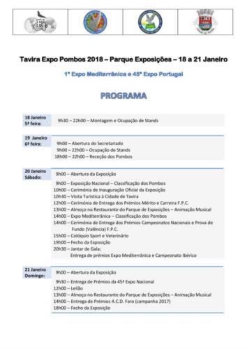 Tavira recebe a 45ª Exposição Nacional e também a primeira edição da Exposição Mediterrânica". O evento resultou de uma ideia que foi debatida em janeiro de 2017, durante as Olimpíadas de Columbofilia, que decorreram em Bruxelas, como revela o presidente da ACDF, Rui Emídio: "Após uma conversa com o presidente da FPC, na qual participaram também o vice-presidente da Real Federación Colombófila Española, o presidente da Federazione Colombofila Italiana e o presidente da FCI, István Bardos, surgiu a ideia de organizar uma exposição mais alargada, capaz de agrupar os países mediterrânicos". O facto de as regiões banhadas pelo Mar Mediterrâneo terem muitas marcas linguísticas provenientes do latim foi outro fator que contribuiu para criação da nova prova. Nesta primeira edição, para além de Portugal, também a Espanha e a Itália terão ‘atletas’ em Tavira.