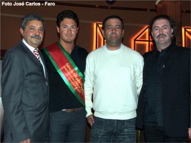 Presidente FPC (José Tereso) e Presidente ACD Faro (Rui Emídio) com os Campeões do Campeonato Nacional Columbófilo Meio-Fundo 2008 (Ivan e Horácio Vargues - Vargues & Van Helsdingen - Faro) - Gala Nacional de Columbófilia - Casino Figueira da Foz (01/02/2009)
