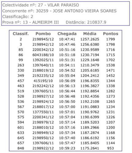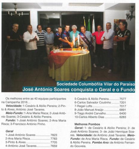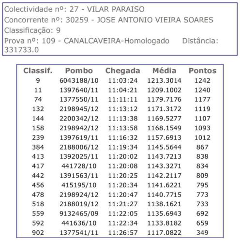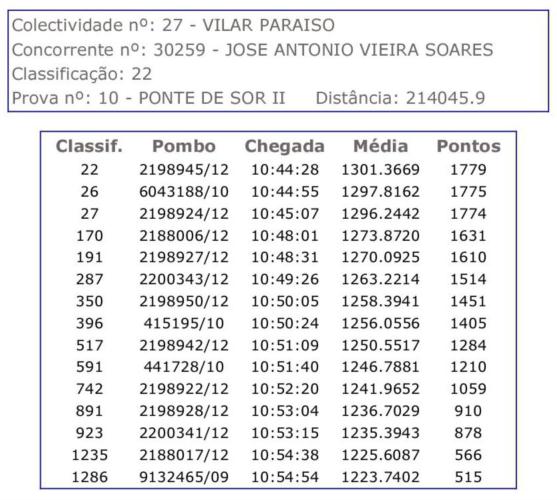 - 1º, 4º, 5º, 9º e 10º melhores pombos de Velocidade da Soc. Col. Vilar do Paraíso