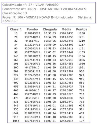 Venho por este meio agradecer ao Sr. Joaquim Antonio C V Martins de Montemor o Novo por ter comunicado a fêmea 2188017/12 que se tinha extraviado no concurso de Montelano I acabando por entrar no seu pombal. Até essa data seguia em 4ª da Geral da Soc. Col. Vilar do Paraíso. Ainda este ano irei oferecer um irmão desta fêmea ao Sr. Joaquim Antonio C V Martins.