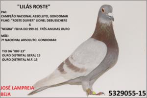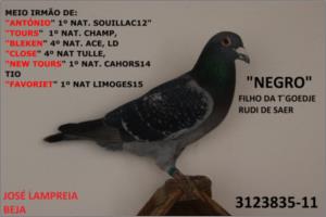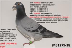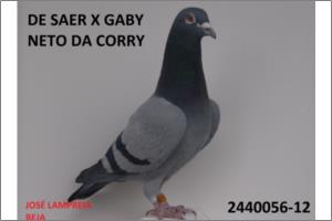 "NETO DA CORRY - RUDI DE SAER" FILHO DE POMBOS DIRETAMENTE DE RUDI DE SAER (CAMPEÃO DE FUNDO NA BELGICA 2010). OFERECIDO POR ANTÓNIO COELHO. MEIO IRMÃO DA ANILHA DE OURO DE VELOCIDADE, LOULÉ 13 MUITO SANGUE GABY VANDENABELE PAI DA 043- 1º/193P, 2º/125, 3º/112