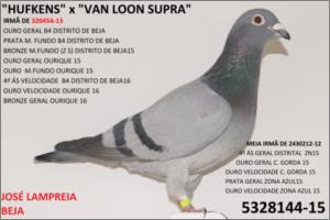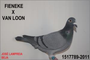 "VAN LOON PALMA" Fêmea AZUL ESTA FÊMEA FOI ADQUIRIDA AO AMIGO PALMA DA CHARNECA DA CAPARICA, CAMPEÃO DISTRITAL VARIAS VEZES, COLONIA DE TOPO A NÍVEL NACIONAL. O PAI DESTA FÊMEA FOI IMPORTADO AO MESTRE VAN LOON. ESTES POMBOS GANHAM COM ALGUMA FACILIDADE ATÉ AOS 700 KM. É TIA DA FÊMEA 1º ÁS NACIONAL DE FUNDO E DA 12º ÁS DE FUNDO 2010 E PRIMA DO 6º NACIONAL DE MEIO FUNDO EM CALDAS DA RAINHA 2012. É TIA DA CAMPEÃ NACIONAL FUNDO REGUENGOS 16 MÃE DA 2430064-12 ANILHA OURO GERAL COL. ZONA AZUL 14 ANILHA DE OURO M. FUNDO COL. Z. AZUL14, ANILHA DE OURO M. FUNDO CABEÇA GORDA14