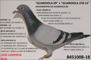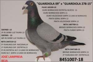 IRMÃO DO GUARDIOLA, QUE É PAI DO: 209 1º ÁS DE BORRACHOS E 1º ÁS VEL.SERPA 11, 2º ÁS GERAL E 2º ÁS VELOC. SERPA 12, DA 3128 2º ÁS BORRACHOS C.G12. AVÓ DO 1º ÁS MF E 3º ÁS BORRACHOS E 3º ÁS FUNDO SERPA 13. AVÓ DO 3º ÁS DERBY TAVIRA13 AVÔ DA 5º YEARLING NACIONAL 14 AVÔ DO 1º E 2º YEARLINGS DO DISTRITO DE BEJA 13 NA EXP. DISTRITAL