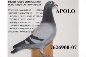 "APOLO 900" Macho AZUL ESTE MACHO FOI EXCELENTE VOADOR: - ANILHA DE OURO EM CASTRO VERDE 2010. - ANILHA DE BRONZE FUNDO DISTRITAL (SUL), 2010. 75º/1331 P. MAHORA 63º/1188 P. ALBACETE 3º/1061 P. CASTELSERAS 7º/2596 P. CASTELSERAS 40º/868 P. ALCANIZ 2º/932 P. REQUENA III 13º/2309 REQUENA III 145º/869 P. MAHORA II PAI DA 3200223-13 3º ÁS DISTRITAL BLOCO2 DIST. BEJA YEARLING 14