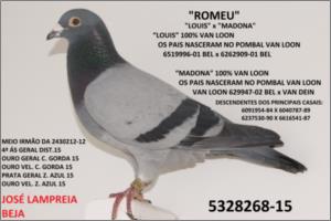 "ROMEU - VAN LOON 268" OS 4 AVÓS SÃO DIRECTOS DO POMBAL DE VAN LOON. O PAI É DE DE EXCELENTE LINHAS A VOAR ENTRE NÓS. A MÃE É UMA EXCELENTE REPRODUTORA. DESCENDENTES DOS PRINCIPAIS CASAIS: 6091954-84 X 6040787-89 6237530-90 X 6616541-87