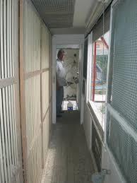 A sua base eleva-se do solo 1,30m, o chão é em rede de 40mm em toda a sua extensão, excepto na secção central em que foi intalado um corredor em madeira junto à janela e encontra-se dividido por portas corrediças.