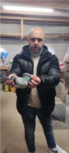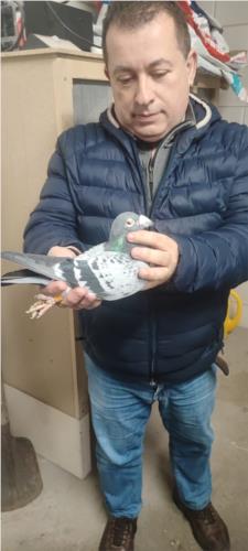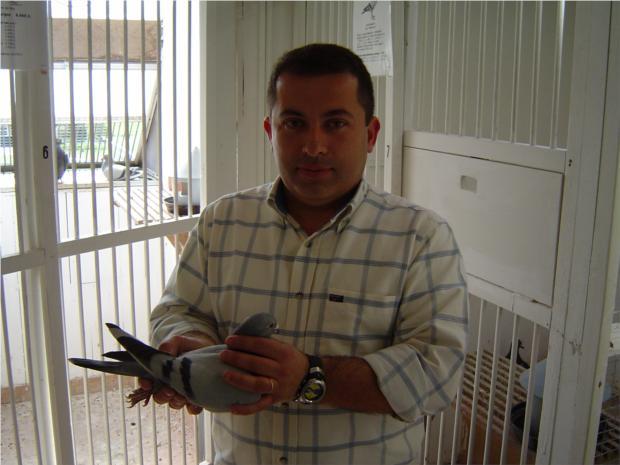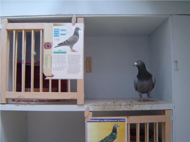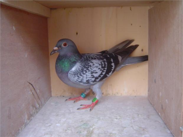 Foto do primeiro pombo de Marcel Sangers num concurso de velocidade (250 km) no qual ganhou 1º, 2º, 5º, etc. entre aprox. 12.000 pombos!!! Esta fêmea é filha de "Pai de Lazer Gun" x Koopman".