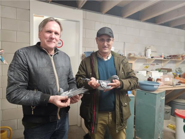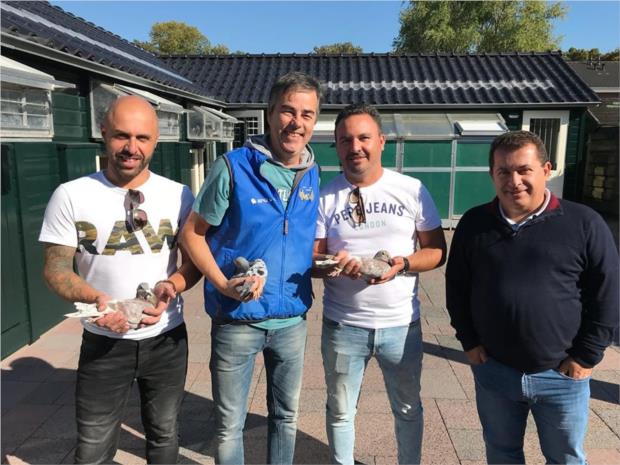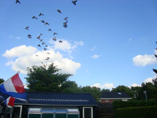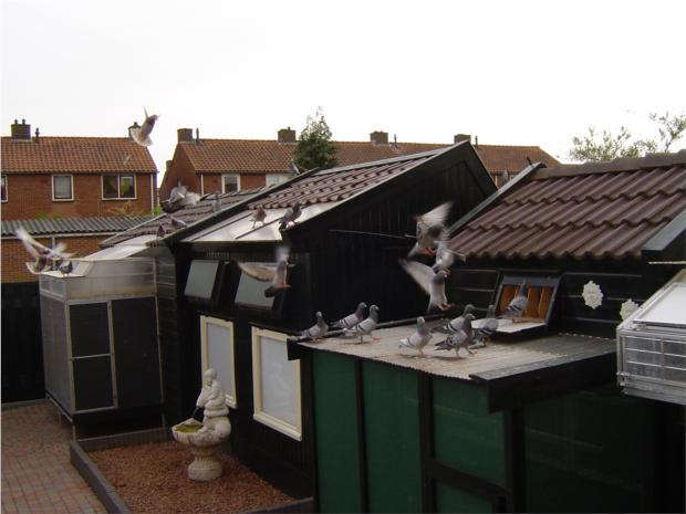 Foto da chegada de alguns dos primeiros pombos de Marcel Sangers num concurso de velocidade (250 km) no qual ganhou 1º, 2º, 5º, etc. entre aprox. 12.000 pombos!!!