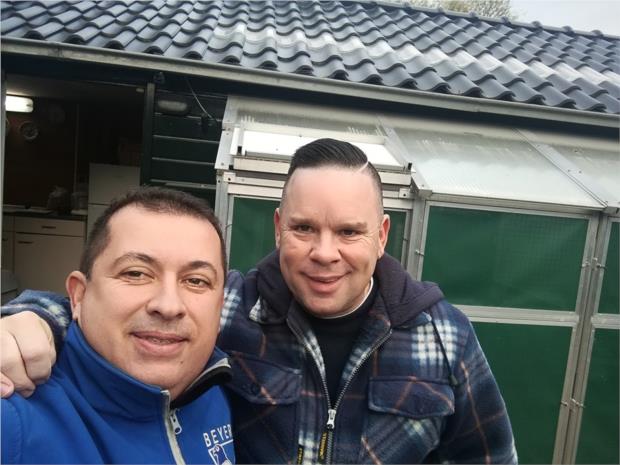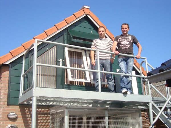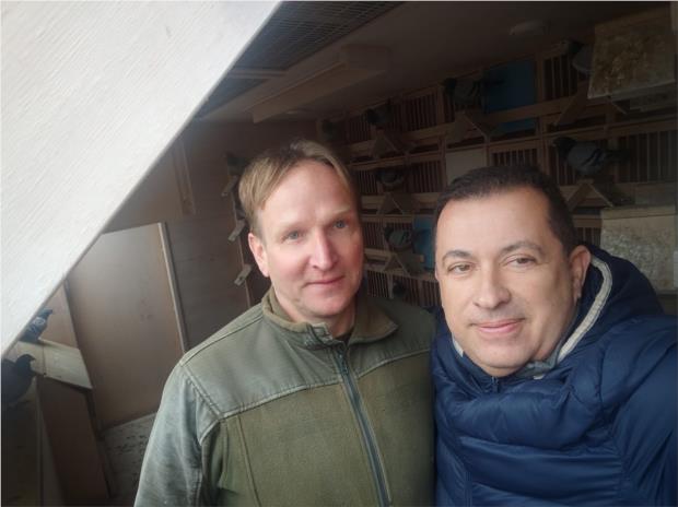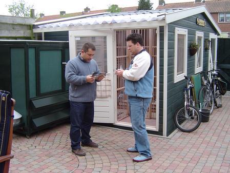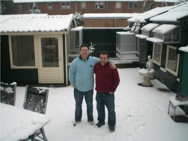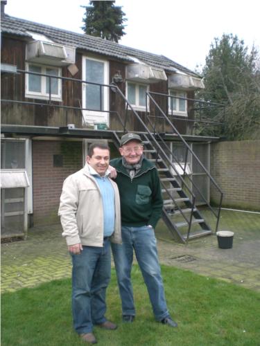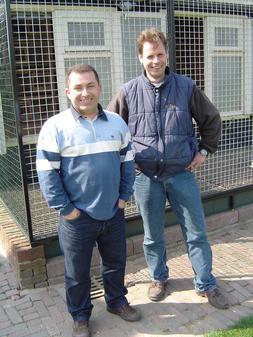 Rui Lobato & Marcel Sangers em frente ao seu pombal de reprodução (Abril 2004 - Zutphen - Holanda). Rui Lobato with his friend M. Sangers (April 2004 - Zutphen - Holland).