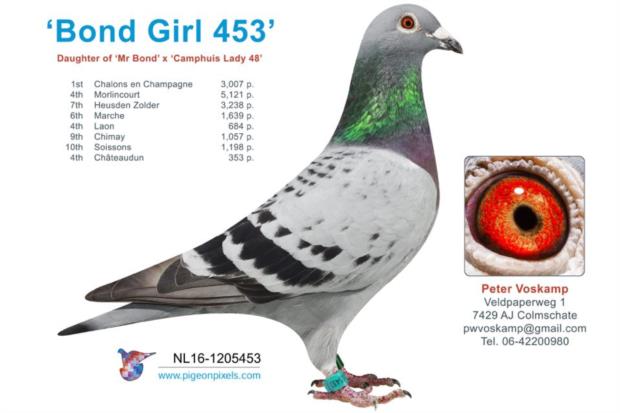 Our last purchase, a young direct daughter of “Kayne” 1. National Short-Distance Ace Pigeon Holland 2019 crossed with other top racer, the Bond Girl 453” from Peter Voskamp.