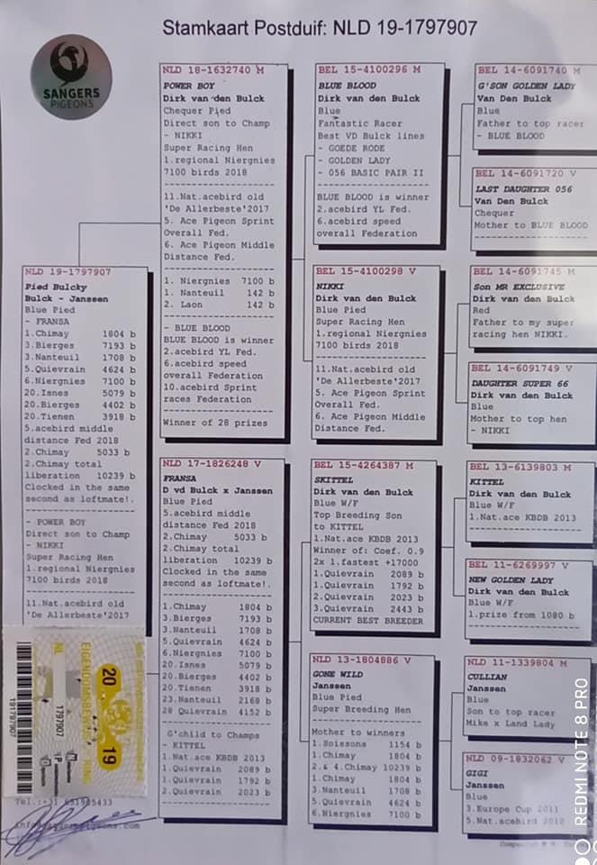 Neta dos super voadores: "Nikki” 1º Provincial Niergnies 7.100 p. 11º Pombo Ás Nacional “De Allerbeste” 2017 5º Pombo Ás Velocidade da Federação 6º Pombo Ás Meio-Fundo da Federação