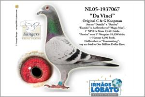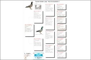Marcel Sangers Irmão de “Tommy Gun” Campeão Provincial Velocidade; “Top Hen’051” 6º Pombo Nacional Fundo 2003; “Talita” Fêmea Campeã da Federação de Zutphen 2003; “Time Gun” 4º Nac. Orleans 7.784 p. e tio de “Flaming Red” Campeão Geral da Federação Zutphen; “André” Campeão Meio-Fundo da Federação Zutphen 2003; “Eagle Eye” Campeão Nacional Fundo 2000; “Fast as Lightning” 5º Nac. Le Mans 11.248p. e 8º Nac. Orleans 18.127 p.; “Nina” vencedora de 57 prémios em 2003 e 2004, etc. Pai – NL95-1400550 “The Super Breeder” reprodutor n.º 1 de Marcel Sangers Mãe – NL95-5536473 “T’kampiontje” neta do “Wonderboy’05” 2º Melhor Pombo da Holanda.