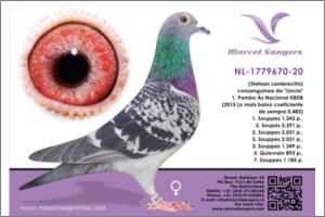 Marcel Sangers (StefaanLambrechts) Filha do "Dominator" filho do Casal n.1 de Stefaan Lambrecths e de uma irmã legitima da "Lincia" 1. Pombo Ás Borrachos Nacional 2015, 1. Souppes 1.243 p., 2. Souppes 2.391 p., 2. Souppes 2.031 p., 3. Souppes 1.348 p., 7. Souppes 1.185 p., 5. Quivrain 893 p.