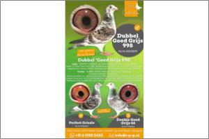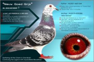 Marcel Sangers (Leideman A & B) Filha do super casal “Son Goed Grijs 998” x “Grizzle Dream” Irmã legitima de “Inbreed Goed Grijs 544” pai do 1. Pombo Ás Nacional Meio-Fundo 2023 Dupla neta da “Goed Grijs” Super voadora, 7 x 1. Prémios 1. NPO Laon 6.371 p. 1. Duffel 5.821 p. 1. Heusden Zolder 2.775 p. 1. Laon 1.052 p. 1. Wijchen 786 p. 1. Heusden-Zolder 656 p. 1. Hapert 231 p. Reprodutora nº 1 de Gebr. Leideman - 3 gerações da “Goed Grijs”, ganharam: 1. Pombo Ás Nacional late tour WHZB/TBOTB 2019 1. Pombo Ás Provincial Velocidade 2022 1. Pombo Ás s-Provincial Velocidade 2019 1. Quievran 25,734 p. 1. Quievran 12,633 p. 1. Gennep 12,570 p. 1. Zutphen 11,284 p. 1. Marche 10,076 p. 1. Prov. Heusden-Zolder 7.320 p. 1. Prov. Menen 5.548 p. 1. Prov. Hannut 5.477 p. 1. Prov. Venlo 4.429 p. 1. Prov. Arlon 3.722 p. 1. Pissanulok Tailandia 333 km 2.310 p. 1. NPO South / 2. Nat. S3 Sens 8.750 p. 2. Pombo Ás Nacional YL Velocidade KBDB 2022