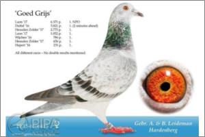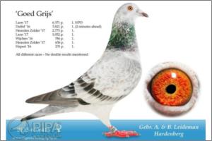 Consanguíneo da “Goed Grijs" Super voadora, 7 x 1. Prémios 1. NPO Laon 6.371 p. 1. Duffel 5.821 p. 1. Heusden Zolder 2.775 p. 1. Laon 1.052 p. 1. Wijchen 786 p. 1. Heusden-Zolder 656 p. 1. Hapert 231 p. Reprodutora nº 1 de Gebr. Leideman - 3 gerações da “Goed Grijs”, ganharam: 1. Pombo Ás Nacional late tour WHZB/TBOTB 2019 1. Pombo Ás Provincial Velocidade 2022 1. Pombo Ás s-Provincial Velocidade 2019 1. Quievran 25,734 p. 1. Quievran 12,633 p. 1. Gennep 12,570 p. 1. Zutphen 11,284 p. 1. Marche 10,076 p. 1. Prov. Heusden-Zolder 7.320 p. 1. Prov. Menen 5.548 p. 1. Prov. Hannut 5.477 p. 1. Prov. Venlo 4.429 p. 1. Prov. Arlon 3.722 p. 1. Pissanulok Tailandia 333 km 2.310 p. 1. NPO South / 2. Nat. S3 Sens 8.750 p. 2. Pombo Ás Nacional YL Velocidade KBDB 2022