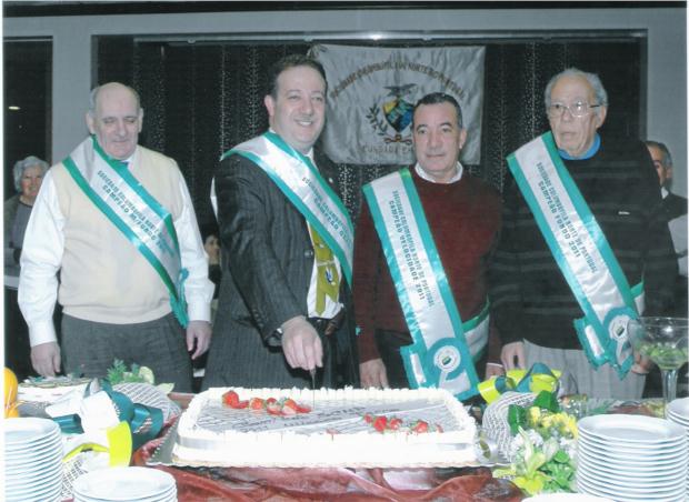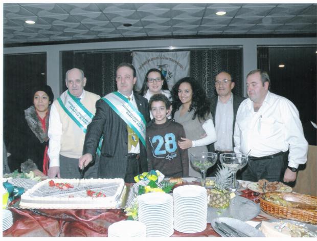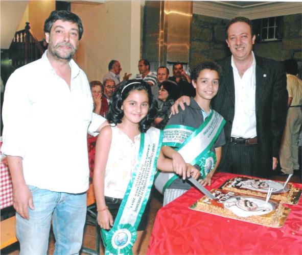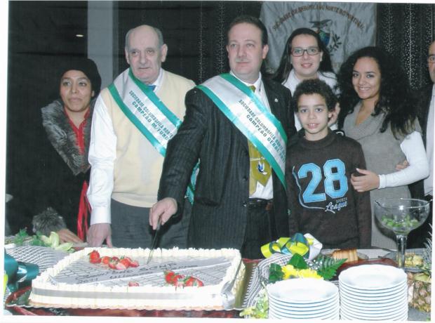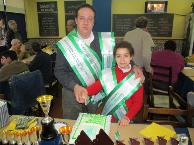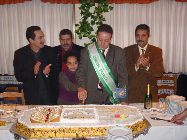 Dr. Nogueira dos Santos, campeão columbófilo, veriador da Câmara da Maia durante a partida do bolo dos campeões Os habituais partidores do bolo de campeão: onde se cantou os parabéns à aniversariante Telémaco Terra e Joana Almeida. Penélope Terra - 8/10/11.