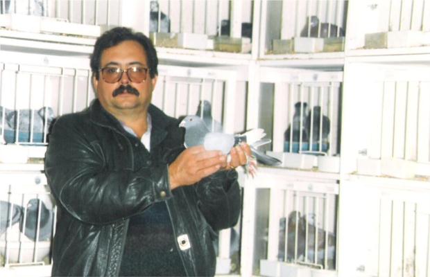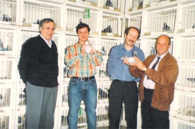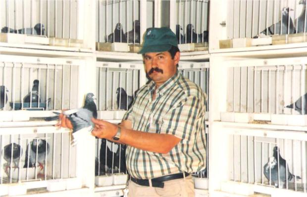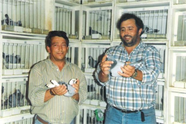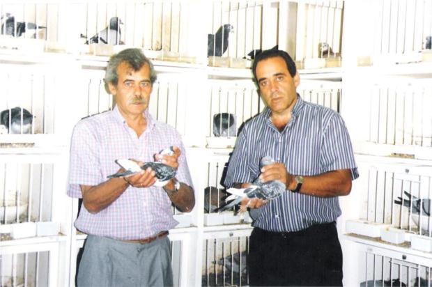 O campeão Ilídio Reis de Oliveira de Azemeis analisando um dos meus craques reprotudores. É importante salientar que a sua famosa 800 bi-campeã nacional, era filha da minha 800 e sobrinha da famosa 800 - a melhor reprodutora do saudoso campeão Carlos Aguiar Costa, que casada com o "Bráspeningue" o fizeram campeão do distrito de Aveiro e do Clube de fundo logo ao 2º ano de columbófilo. Chegando a ganhar no mesmo fim de semana 1º e 2º de fundo e 1º e 2º de velocidade com 4 filhos da minha famosa 800, que era a sua super reprodutora por mim novamente comprada no leilão final da colónia.