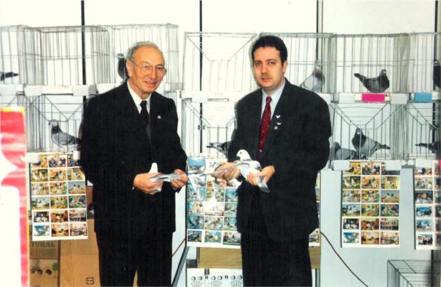 O saudoso e famoso professor doutor Rodrigues Branco numa das suas sempre bem-vindas visitas ao meu stand. Esta ocorreu em 1997 no Palácio de Cristal - Porto, onde eu aproveitava para aprender e tirar duvidas sobre profilaxia columbófila pois estava aprendendo com um dos melhores investigadores de medicina.