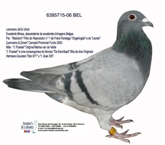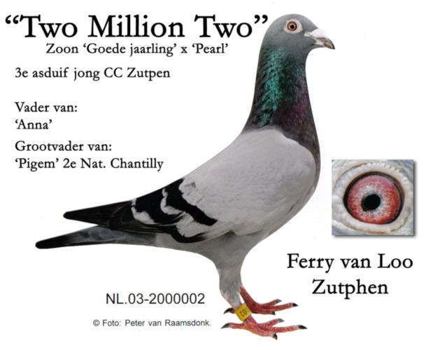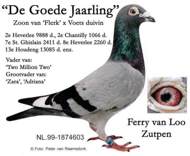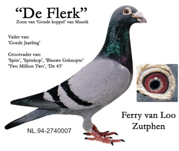 Original Ferry van Loo (Maurice Voets/Goyvaerts x Marien Royberghs) Pai – NL94- 2740007 “The Flerk” Super Reprodutor, pai do “Good Yearling” 2º Heverlee 9.888 p., 2º Chantilly 1.066 p., 7º st gh Hornu 2.411 p., 8º Heverlee 2.260 p., 13º houdeng 13.085 p., 15º Houdeng 11.404 p., 18º Tessenderloo 11.043 p., 12º Chantilly 4.188 p., 14º Chantilly 5.224 p. e 19º Peronne 5.646 p.. Avô do “Spits” Campeão Meio-Fundo da Federação em 2000 e 5º Melhor Pombo de Meio-Fundo da Federação em 2001 e avô da “Two Million Two” 3º Melhor Borracho da Federação em 2003 Mãe – NL-98-6312919 “Renee”.