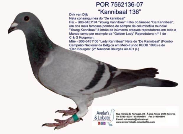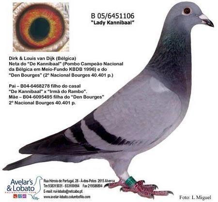 Dirk van Dijk. Neta consanguinea do famoso "De Kannibaal". Pai - Filho do famoso “De Kannibaal”, um dos mais famosos pombos de sempre da columbofilia mundial. "Young Kannibaal" é irmão de inúmeros craques reprodutores em todo o Mundo como por exemplo da “Golden Lady” Reprodutora n.º 1 de C & G Koopman. Mãe - Neta do “De Kannibaal” (Pombo Campeão Nacional da Bélgica em Meio-Fundo KBDB 1996).