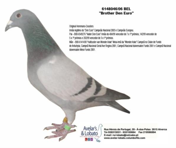 Original Dirk & Louis van Dijk (Bélgica) Neta do “De Kannibaal” (Pombo Campeão Nacional da Bélgica em Meio-Fundo KBDB 1996) e do “Den Bourges” (2º Nacional Bourges 40.401 p.) Pai – B04-6468278 filho do casal “De Kannibaal” x “Irmã do Rambo” Mãe – B04-6095495 filha do “Den Bourges” 2º Nacional Bourges 40.401 p.
