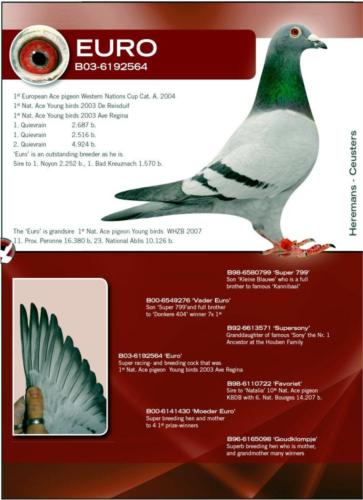 Pai – B00-6549276 “Vader Den Euro” Irmão do 404/99 vencedor de 7 x 1º prémios, 142/99 vencedor de 5 x 1º prémios e 202/99 vencedor de 3 x 1º prémios. Mãe – B00-6141430 “Halfzuster van Wonder Aske” Meia-irmã da ”Wonder Aske” Campeã no Clube de Fundo de Antuérpia, Campeã Nacional Geral Ave Regina 2001, Campeã Nacional duivensalon Fundo 2001 e Campeã Nacional duivensalon Meio-Fundo 2001.