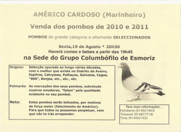 Vai realizar-se na próxima Sexta Feira (19 de Agosto) pelas 20h30, na Sede do Grupo Columbófilo de Esmoriz, um leilão dos pombos do nosso sócio Américo Cardoso (Marinheiro).