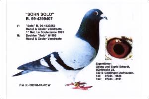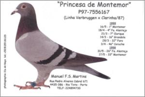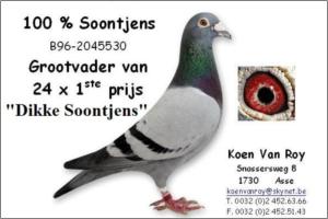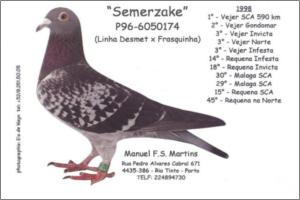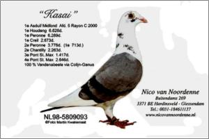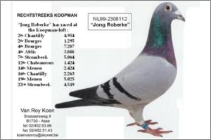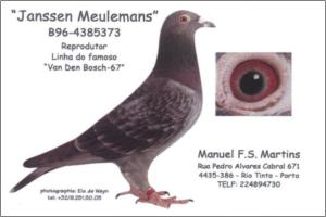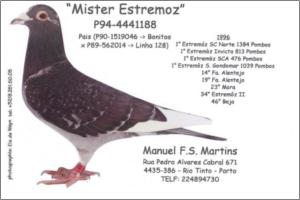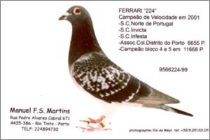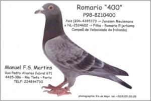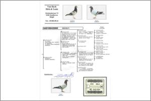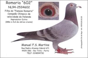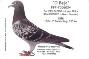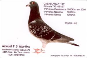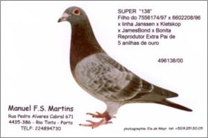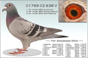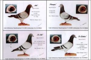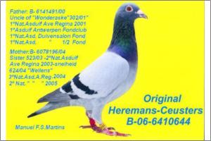 ORIGINAL "HEREMANS / CEUSTERS" Pombo nº B-6410644/06 (Linha de pombos extra) O pai B- 6141491/00 é filho do "Goede Witpen" 18 x 1ºs prémios é irmão do 358/02- 1ºNat.AsduifA.Regina halve-fond 2002 é tio do "WonderAske" 302/01" 1ºNat.Asduif A.Regina 2001 1ºAsduif Antwuerpen fond club 2001 1ºNat.Asduif Duivensalon halve-fond 1ºNat.Asduif Duivensalon fond do "Samson"060/01"- 1ºNat.Argenton 33.097 pombos. A mãe B-6078196/04 é irmã do "Peter" B-6192523/03 2ºNat.Asduif A.Regina 2003 é irmã do "Wellens"B-6073624/04 3ºNat.Asduif A.Regina 2004 2ºNat.Asduif A.Regina 2005 41 encestamentos = 40 prémios Nota: O "Peter "523" foi adquirido por " Eijerkamp & Zonen" O " Wellens "624" foi adquirido pelo Dr. René Becker A mãe do "Euro" B-6141430/00 adquirida por "Eijerkamp &Zonen" é meia irmã do "WonderAske 302/01"