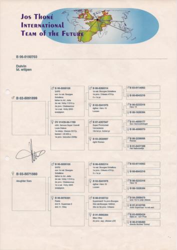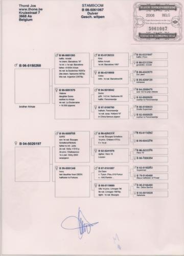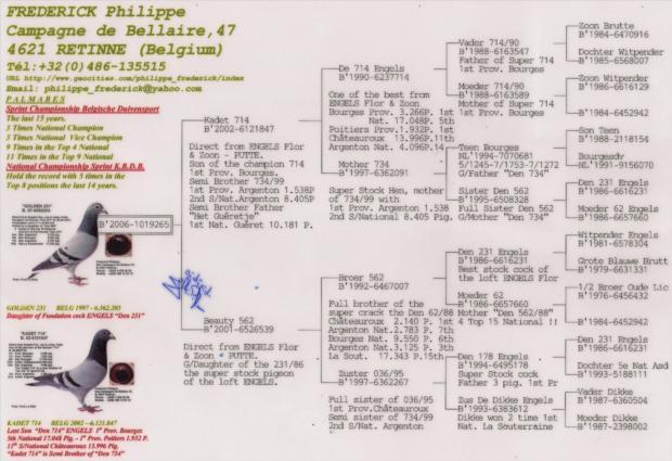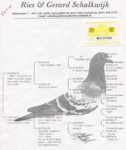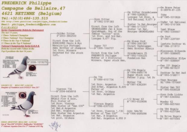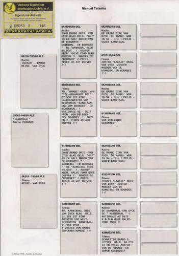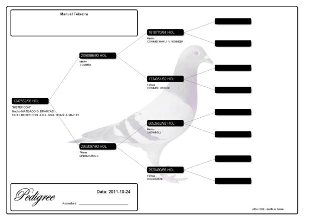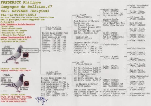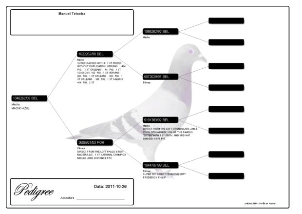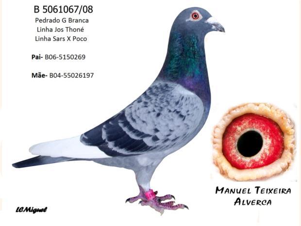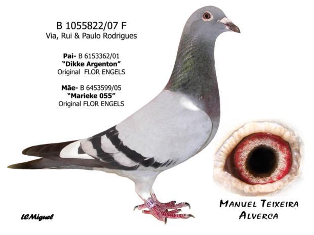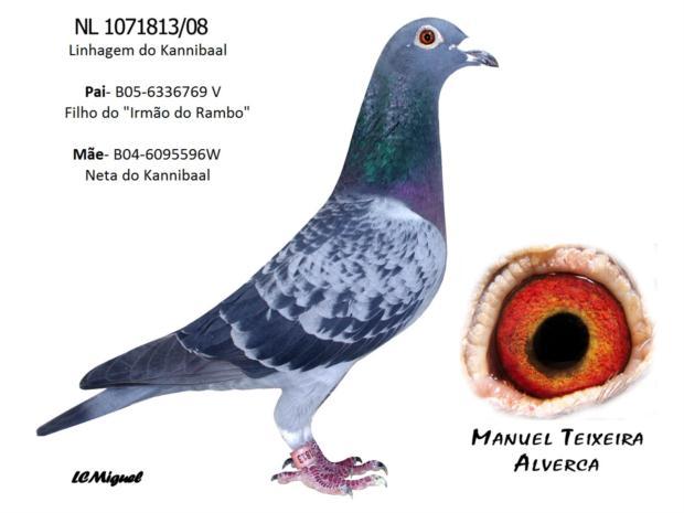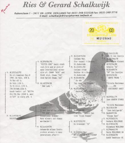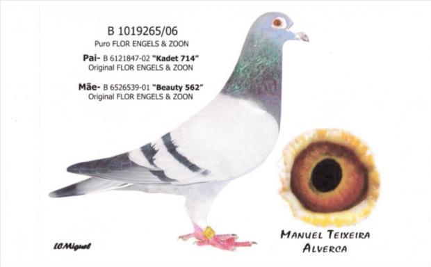 O meu pombo é irmão do "Mike", 2º ás velocidade e 3º ás meio-fundo 1998 na Holanda. Verificar no site Ries Schalkwijk, onde está mencionado os seis nomes de columbófilos europeus que possuem filhos directos do "Mister Coni"