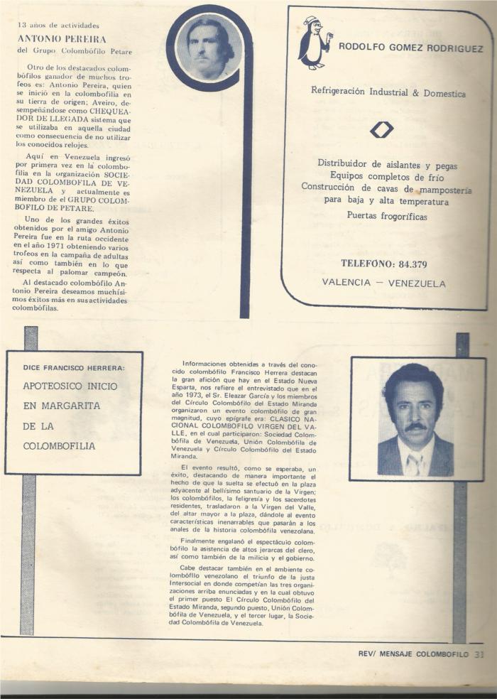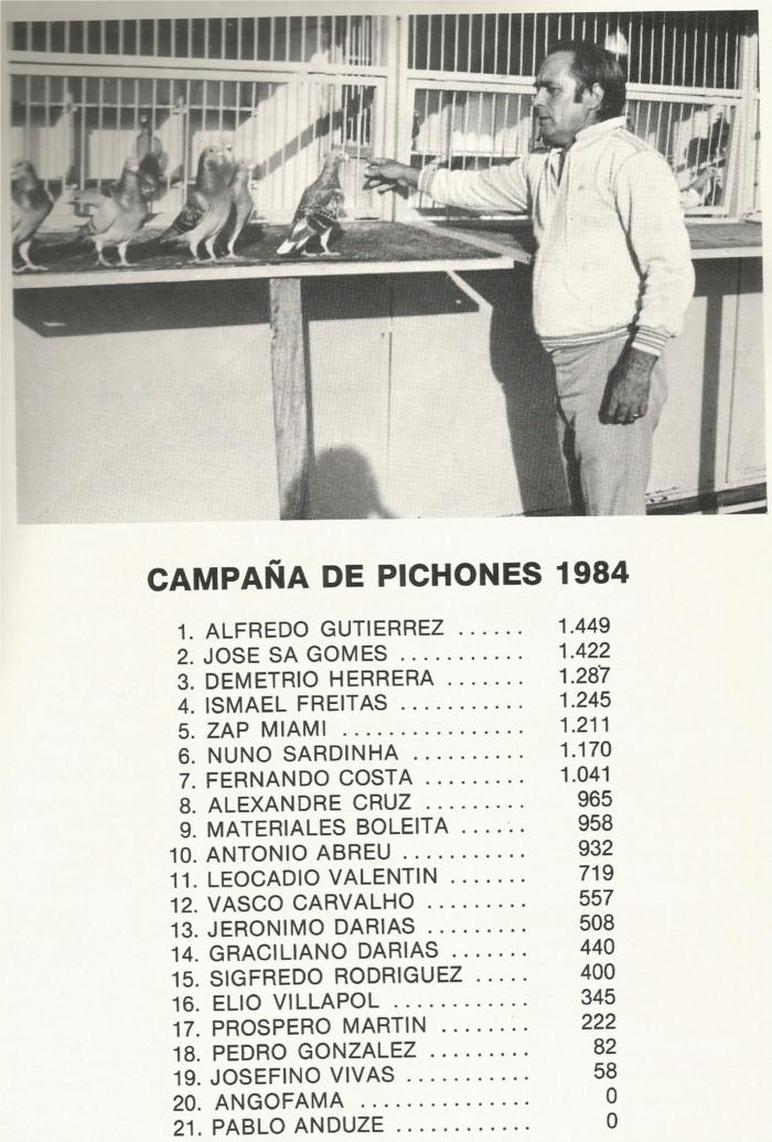 Alfredo Gutierrez, gran colombofilo desde que era un niño, cultivador de las palomas "CARRILLO" traídas de su tierra natal Tenerife y de las antiguas palomas cubanas Stassart de Perez Lerena y los Stassart de Charles Heiman importadas por el Sr. Pedro Lopez de Kentucky (EEUU). Viajó en las tres Sociedades existentes en Caracas, La Sociedad, La Unión y el Grupo de Petare. Persona humilde que luchó por sacar una familia, su esposa una gran señora y sus tres hijas. Practico la lucha Canaria durante varios años y era un personaje de respeto. En mi confianza que tenía con el le solía llamar el mudo porque hablaba hasta por los codos. Sus palomas formaban parte de la familia. Después de mas de 30 años viviendo en Venezuela , visitó su tierra natal Tenerife y trajo casi toda su reproducción para venderla, después de un corto período regreso para Venezuela y dos meses después nos llegó la desagradable noticia de su muerte. Aun existen palomas con la marca Alfredo Gutierrez y con muy buenos resultados. En la foto que verán a continuación lo podrán ver en su palomar en la zona de Petare, Venezuela y celebrando su campeonato de pichones en la Unión Colombofila De Venezuela.