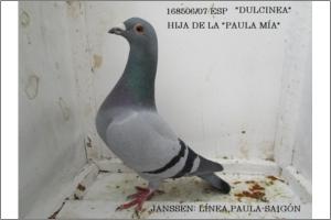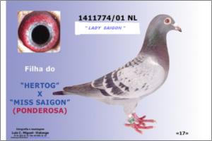 ORIGINAL DE EIJERKAMP . Hija directa del HERTOG X MISS SAIGON. 1/2 Hna. de "KAIN y ABEL", Tia del nuevo crack " CHE " que ganó 9º Nat.Orleans 556 Kms año 2005 de 18.184 p. 1º Nat. de Orleans año 2006 de 14.285 p. , 1º Nat. Arras 310 Kms año 2006 de 9.641 p. NOTA: Esta paloma fué vendida para Lisboa- Portugal pero dejó 14 Hijos con tres diferentes machos.