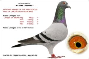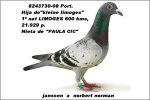 HEMBRA RODADA. JANSSEN X N & F NORMAN. HIJA DEL "KLEINE LIMOGES" 1º NAT DE LIMOGES BELGICA 600 KMS, DE 21.929 P. NIETA DE "A PAULA C.I.C"
