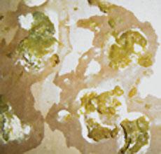 Fezes de um animal doente: Com aspecto mucoso ou espumoso, com goats espalhadas de uma côr verde amarelada.