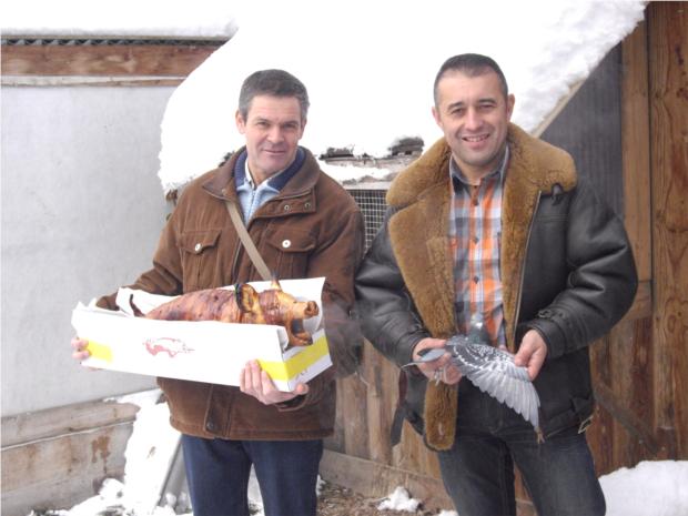 Depois de tanta neve tirada e de esaminar os meus pombos (Os Bravos) nada melhor que um leitao assado por mim a moda da minha ( Bairrada ) .E outro dos meus gostos (assar leitoes) .Na fotografia o meu grande amigo Carlos Almeida com o leitao e eu (Os Bravos) com o pombo que ganhou 1-° premio no ultimo concurço da campanha com uma excelente media .