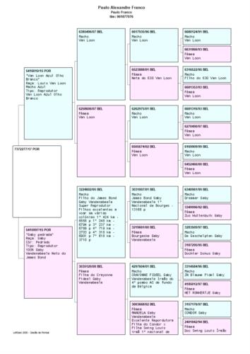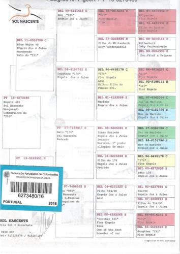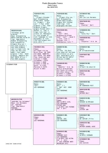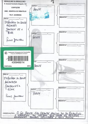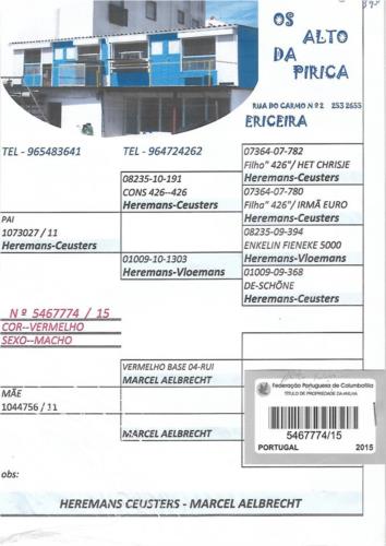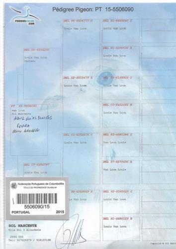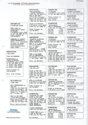 Os seus reprodutores assentavam nos seguintes pombos : 2391094/03 Pata Colada ( era janssen da linha do Merckx ); 2396478/93 NL- Holandesa Velha também da linha do merckx; 929248/89 belga do Xico e pai do 19; 1278519/91 que foi 1º nacional sport de Meio fundo na Exp. Nacional em Évora (era jansem X belga do Xico); 1503642/90 uma azul e branca 8belga do Xico); 8750263/98 pai do 50 ( janssem X belga do Xico. A nivel do fundo baseava-se nos Van Spitael 3260508/93 e 2156677/92.