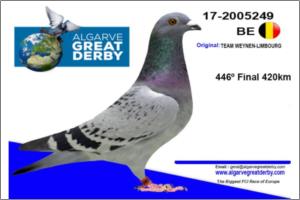 "FEIJÚ" Raça: Smoorenberg Smulders Neta do casal sensação na Holanda e Belgica 2012 Original Stefaan Lambrechts. O irmão do pai adquirido por W.A. de Bruijn 184/11 --9º Asduif Jong Nat. TBOTB 2011. Vários irmãos a class. NPO no pombal Eijerkamp etc. Meia-Irmã do 2º melhor pombo Holandez Algarve Goldem Race 2012